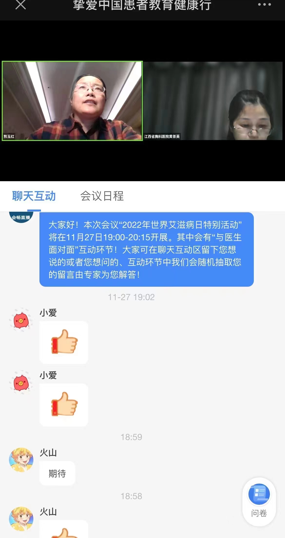 今年世界艾滋病日的宣傳活動主題為“共抗艾滋 共享健康”,強調(diào)每個人都參與進來,攜手應(yīng)對艾滋病流行帶來的風(fēng)險與挑戰(zhàn),倡導(dǎo)全社會共建共治共享。受疫情的影響,今年宣傳活動采取線上和線下形式開展。11月27日晚,江西省胸科醫(yī)院感染免疫科通過線上向艾滋病患者宣傳和普及艾滋病相關(guān)知識。本次會議提前向艾滋病患者發(fā)布宣傳海報,熊玉紅主任深入淺出地向艾滋病患者講解艾滋病預(yù)防、治療及健康管理等相關(guān)知識,并通過一個個成功的案例激發(fā)患者對疾病的治療信心,鼓勵患者“活在當(dāng)下,未來可期”。在“與醫(yī)生面對面”互動環(huán)節(jié),患者在聊天互動區(qū)留言提問,專家隨機抽取留言解答問題。熊玉紅主任醫(yī)師和黃茶英副主任護師共同在線解答了30多條提問?;迎h(huán)節(jié)精彩紛呈,會議持續(xù)1個半小時,共381位患者參會,取得了良好的效果。